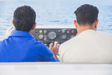 Sailing navigation panel console on sail boat. Navi sea equipment, screens and modern compass