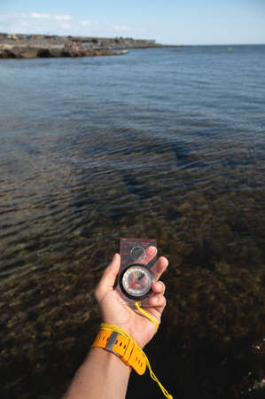 A mans hand holds a transparent magnetic compass against the background of the sea surface in calm calm. Orientation or travel concept.