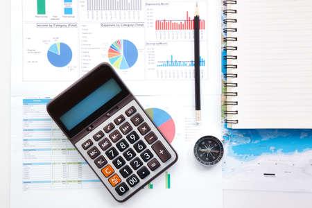 Bussiness graphs and finances with a compass lying nearby.
