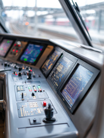A close-up of a train cabin control panel with screens and controls for navigation and operation.