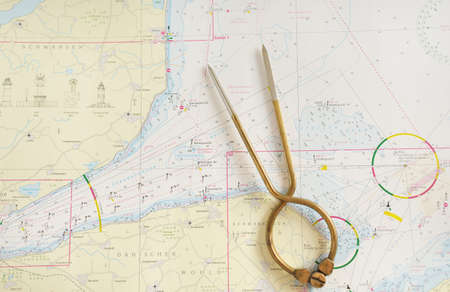 Antique W HC 6 brass dividers calipers nautical navigation chart tool and white map close-up. Vintage still life. Sailing, travel accessories. Planning, concept art, graphic resources, copy space