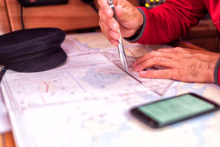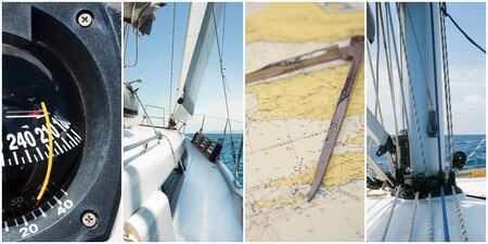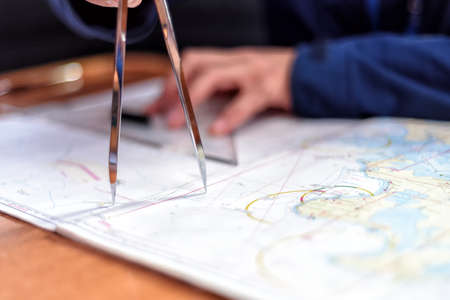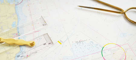 Navigation still-life. Skipper equipment, compass, ruler, protractor and a map. Sailing concept.