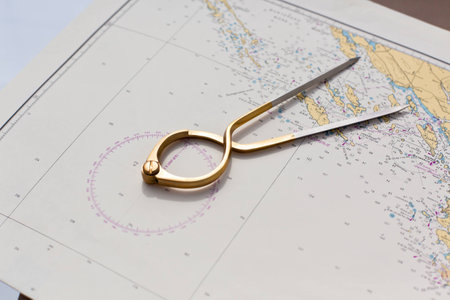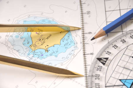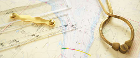 Navigational tools and compass on a nautical navigation map