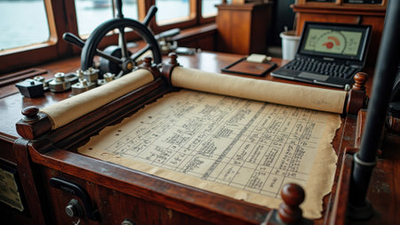 Vintage nautical chart on wooden ship bridge with navigational instruments. That the image is generated using AI.