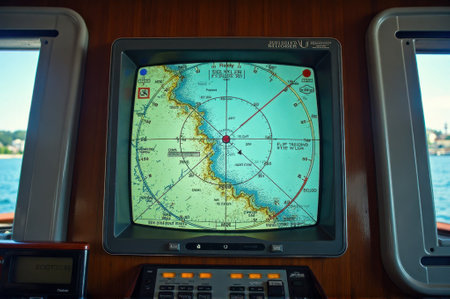 Navigation system display in ship cockpit with coastline map on screen.