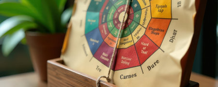 Colorful wine flavor wheel on wooden stand with potted plant in background.