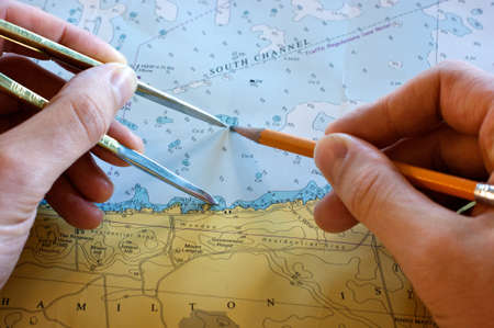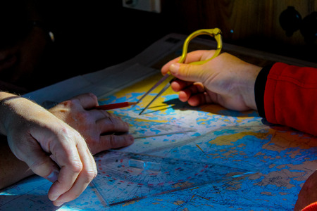 Hands next to a sea chart doing navigational route planning