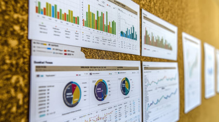 This image showcases a bulletin board displaying various business performance metrics through colorful charts and graphs, ideal for professional analysis and team discussions.