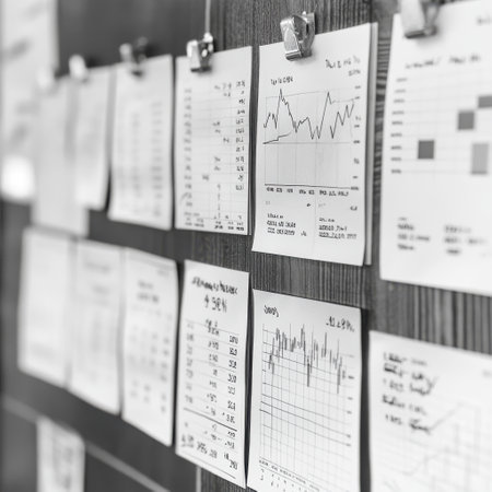 A collection of price charts pinned neatly to a bulletin board illustrates various financial trends and data analysis. The charts provide insights into market performance over time.