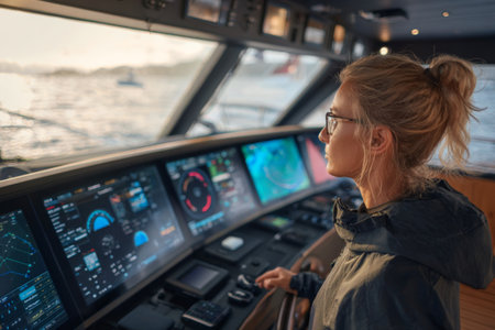 At sunset, a young woman steers a yacht, focused on the advanced control panel displaying navigation data. Calm waters surround the vessel, creating a serene atmosphere.