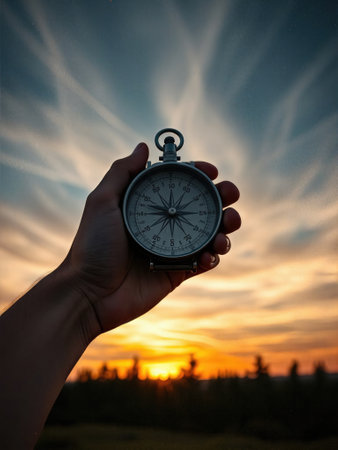 Compass in hand on the background of the setting sun. Conceptual image.