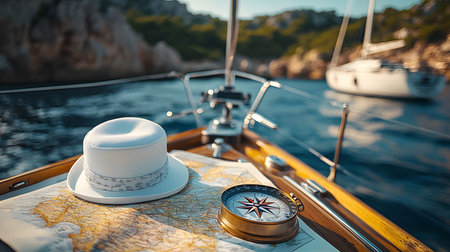 White hat and compass on the deck of a sailing yacht in the sea