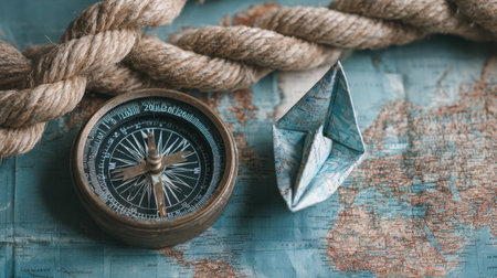 A close-up of a vintage brass compass resting on a weathered world map, with a thick nautical rope tied in a knot, evoking a sense of adventure and exploration.