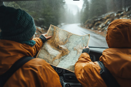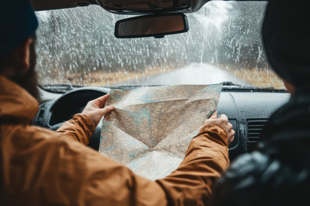Inside a car on a rainy day, two travelers examine a paper map, preparing for an exciting road trip adventure ahead.