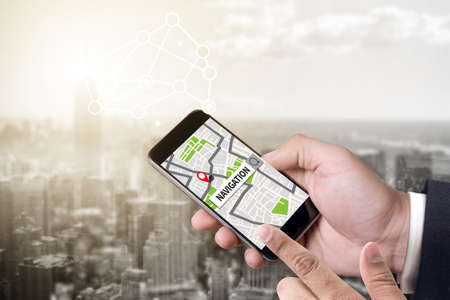Navigation auto map system. Global positioning system on smartphone screen in auto car on travel road. GPS navigation with smartphone application system