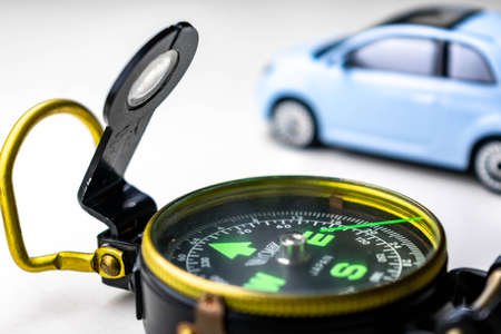 Conceptual landscape with a metallic compass on the leading lines of the road,Sfanta Ana, Romania