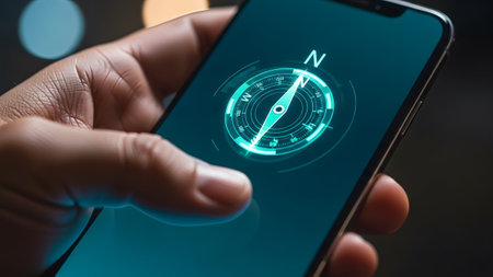 A hand grips a smartphone displaying a holographic compass indicating north, with a blurred...