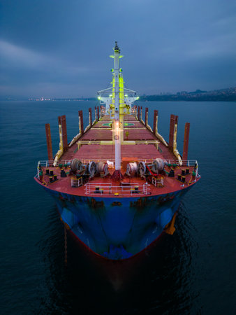 aerial view of a bulk carrier at evening showcases a stunning display of lights reflecting off the water as the massive vessel cuts through the waves. The contrast between the darkness of the ocean and the brightly lit ship creates a captivating and atmospheric scene.
