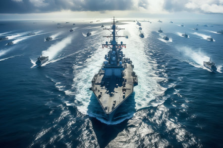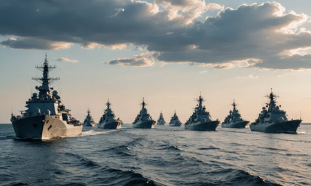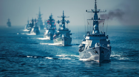 Row of military warships sails on sea, varied sizes in line. Bold naval scene captures strength and unity.