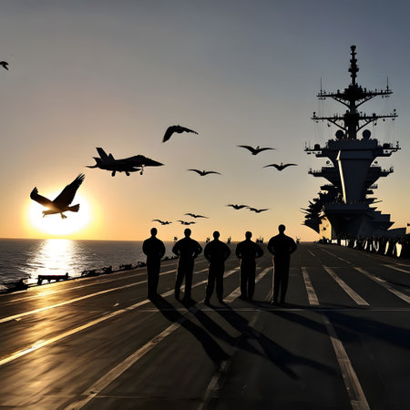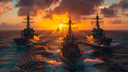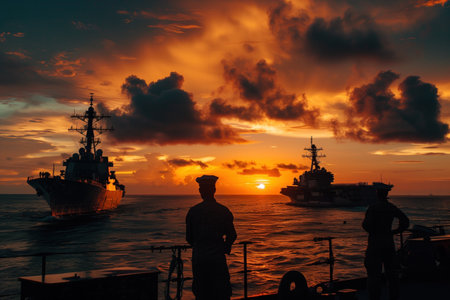 Naval Fleet at Sunset with Silhouetted Sailors on Duty