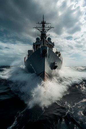 Naval Ship Navigating Rough Seas with Crew Onboard Under Dramatic Sky