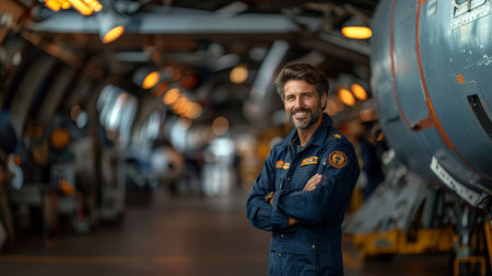 Confident male pilot in uniform standing inside a well-lit aircraft hangar, smiling warmly with arms crossed, conveying professionalism and leadership.
