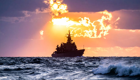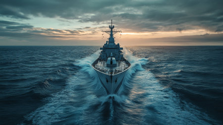 A naval warship cuts through the ocean waves, its powerful silhouette stark against a dramatic and fiery sunset. The scene evokes a sense of duty, power, and solitary patrol on the vast, open sea during a beautiful yet intense golden hour.
