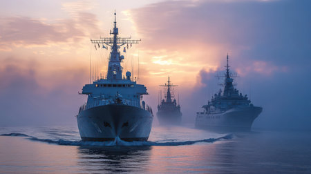 Three naval vessels move through a misty landscape as the sun rises, creating a serene yet powerful atmosphere over tranquil waters, highlighting their silhouette against the dawn sky.