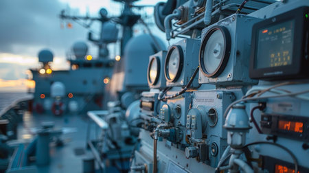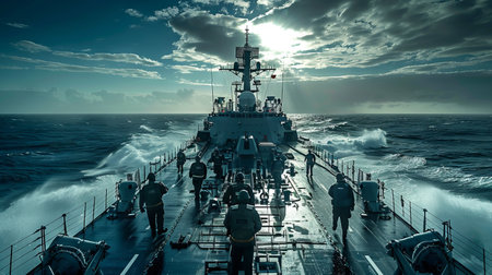 The picture of the naval officer working on the ship or the battleship that sailing into the ocean, the marine require skills like teamwork, physical fitness, marine knowledge and engineering. AIG43.