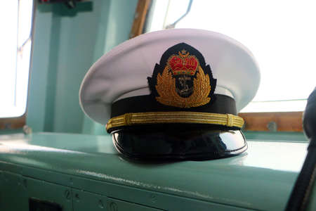 Pelabuhan Klang, Malaysia - April 13,2019: Malaysian Royal Navy office's hat in KD Jebat command bridge during 85th Malaysian Royal Navy open day in Pelabuhan Klang, Selangor.