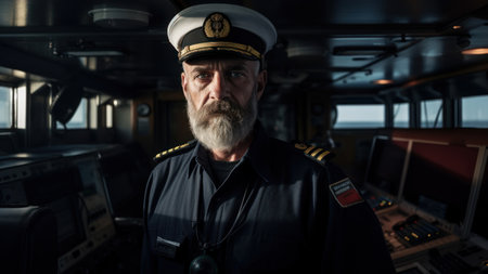 Portrait of a senior pilot in the cockpit of a ship.