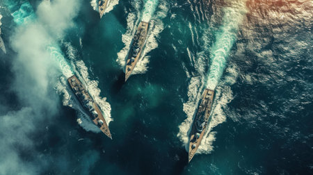 Modern naval warships conducting military training exercises in the vast expanse of the open sea