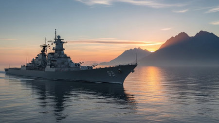 A large, imposing battleship is depicted sailing on calm, reflective waters. The scene is set at sunrise, with soft golden light illuminating the sky and casting a warm glow on the distant, mist-shrouded mountains. The ship's silhouette is sharp against the tranquil water, and its reflection is visible. The overall atmosphere is one of quiet power and beauty, blending military might with natural serenity.