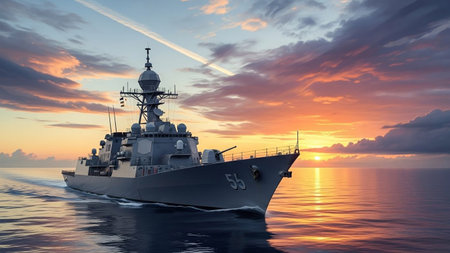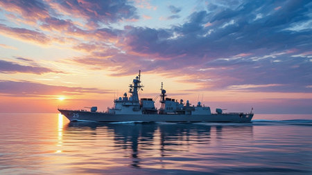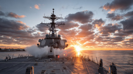 A modern naval destroyer is depicted sailing on a calm ocean during a dramatic sunset. The sky is filled with vibrant orange, pink, and yellow clouds, reflecting on the water's surface. The warship, with its imposing structure and weaponry, is positioned in the foreground, cutting through the gentle waves. The reflection of the ship and the colorful sky creates a striking visual. The scene evokes a sense of power, majesty, and the vastness of the sea.