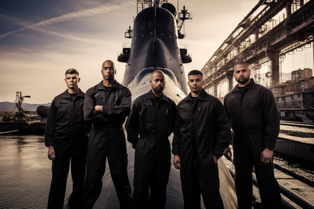 Submarine crew men standing near the ship and looking at camera. Important mission for brave people. Generative AI