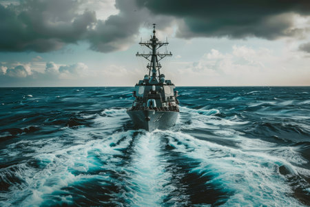 A high-resolution image of a large naval vessel patrolling the open sea, with a focus on the ships sleek design and the expansive ocean background.