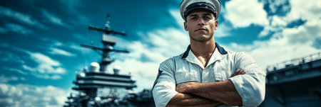 Navy sailor in full uniform standing proudly before a modern warship styled like a bold 1950s recruitment poster, banner