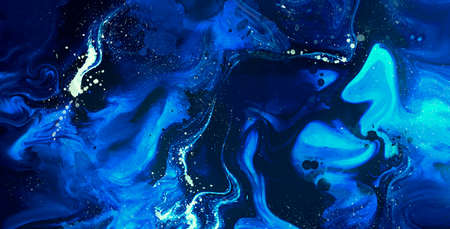Fantasy fluid art background in blue tints with gilding. Flowing ripple effect of liquid ink. Dark phantom blue with gold. Fluorescent abstract texture of acrylic paints on canvas. Surreal mix colors.