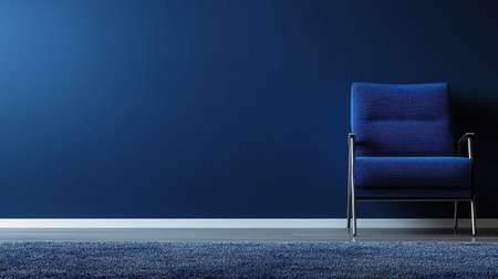 Modern interior design background with a dark blue wall and armchair, a carpet on the floor, minimalistic home decor, an interior mock-up, and a copy space concept. --chaos 30 --ar 16:9 --v 6.1 Job ID: 137ca820-1a02-46d9-b5dd-cd15cfe7d4bb