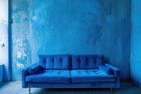 A vibrant blue vintage sofa set against a textured blue wall in a minimalist living room