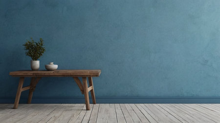 wooden stool in front of blue wall with copy space for text