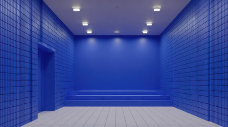 Strikingly monochromatic room bathed in intense blue color, where three walls are covered in small, stacked rectangular tiles, contrasting with a smooth, flat back wall above a set of low, broad steps forming a small stage area. The ceiling is white and features several square, flush-mounted light fixtures casting downward spotlights, while the floor is covered in light gray or white square tiles.