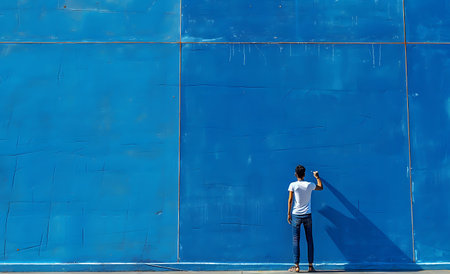 Back view of young man painting on blue wall with brush. Copy space