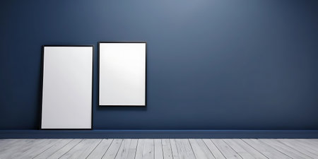 Two blank picture frames on blue wall. Mock up, 3D Rendering