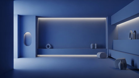 A minimalist interior with monochromatic blue walls, subtle ambient lighting, and abstract decorative on shelves.