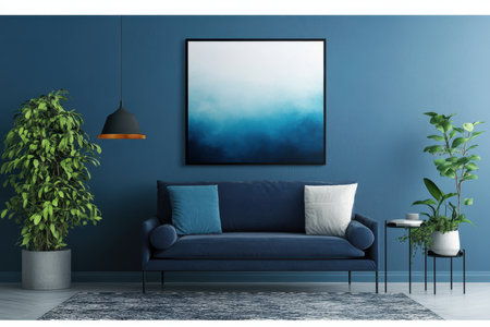 A stylish modern living room showcases a navy blue couch adorned with pillows, complemented by elegant wall art and plants, creating a cozy atmosphere.