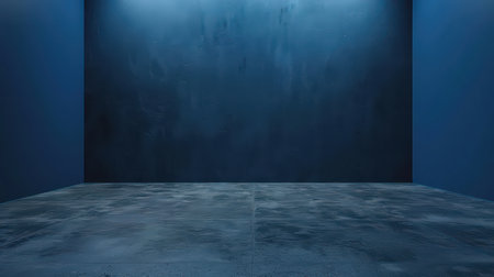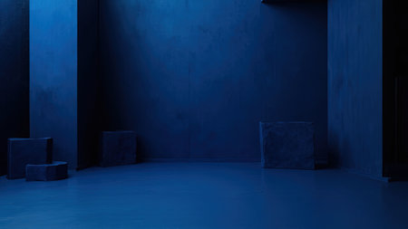 Step into a captivating dark blue room defined by geometric forms and dramatic shadows. This interior design aesthetic presents a moody, minimalist atmosphere, perfect for a modern presentation or product showcase. The empty space, with its abstract backdrop and sleek architecture, offers a striking visual impact. Utilize this versatile image for creating compelling visuals, highlighting your brand, or providing an eye-catching surface for your designs. The monochromatic color scheme and block-like structures create a clean, contemporary feel.