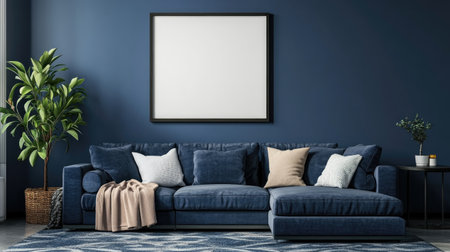 This stunning living room features navy blue walls and a stylish couch adorned with decorative cushions, creating a sophisticated yet cozy atmosphere. A large empty frame awaits artwork, enhancing the contemporary design.