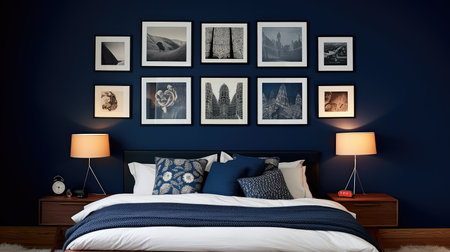 Modern navy blue wall in simple bedroom with cozy, double bed and two bedside tables with lamps and decorations