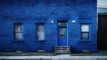 An AI generated illustration of An isolated, blue-colored building is featured with a blue door and windows